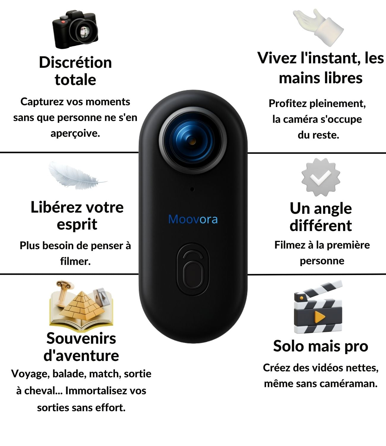 Support magnétique : Moovora est doté d'un système magnétique intégré qui permet de l'attacher facilement à des surfaces métalliques, tout comme la lanière présente dans les accessoires pour un enregistrement stable.